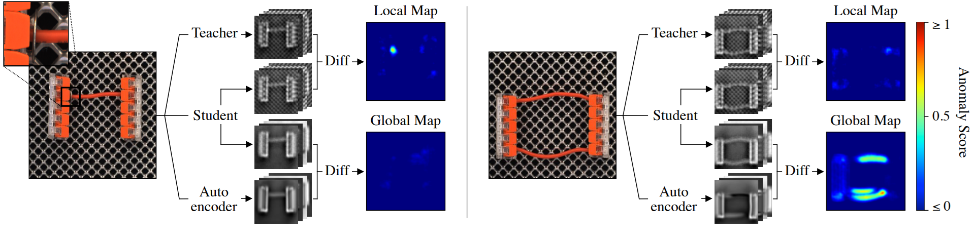 최종 이상 탐지는 Student-Teacher 모델의 local 이상 맵과 Autoencoder 기반의 global 이상 맵을 결합하여 정규화한 후 판단한다.