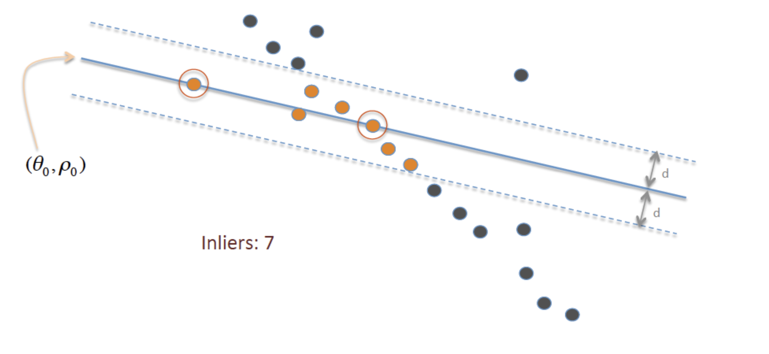 RANSAC의 가장 중요한 개념 중 하나는 Inlier 판별이며, 다음과 같은 수식으로 표현할 수 있습니다.